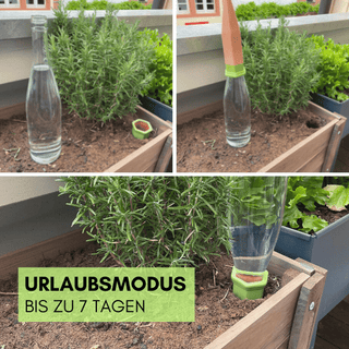 Im Alltag kannst du einfach die Tonkegel befüllen und warten bis diese nach 2 bis 3 Tagen leer sind. Fährst du etwas länger weg, kannst du eine volle Wein- oder PET-Flasche in den Kegel stecken und mit gutem Gewissen bis zu 7 Tage in den Urlaub fahren.
